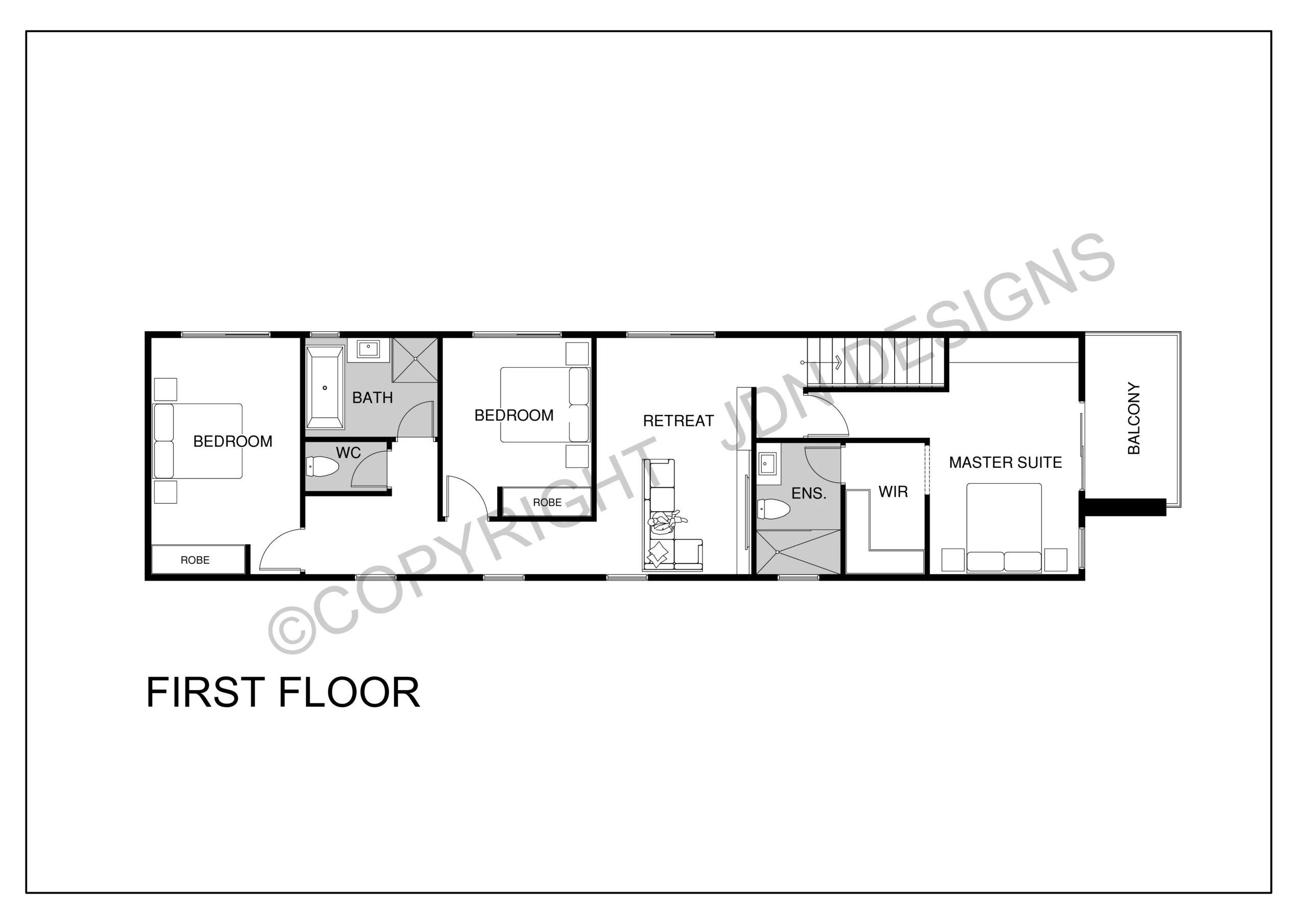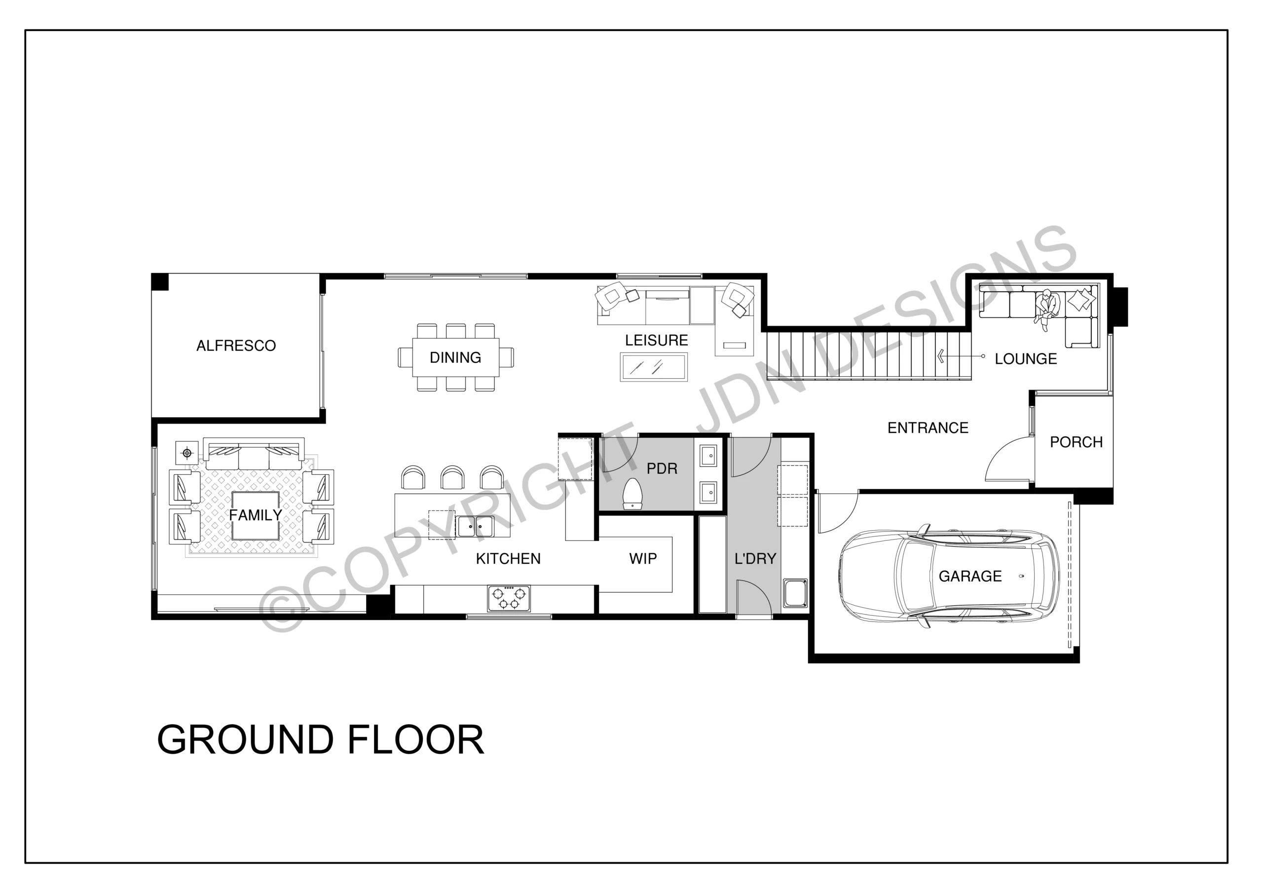 This box model double-storey dwelling, designed by JDN Designs, features a striking contemporary façade characterized by clean horizontal lines. The exterior combines dark stone cladding with smooth light-rendered walls, creating a beautiful contrast that highlights both warmth and sophistication. Large windows maximize natural light and give the home an inviting, modern appeal. The balcony on the first floor gives additional space for the master suite. This house has 3 bedrooms, two bathrooms and a single garage.