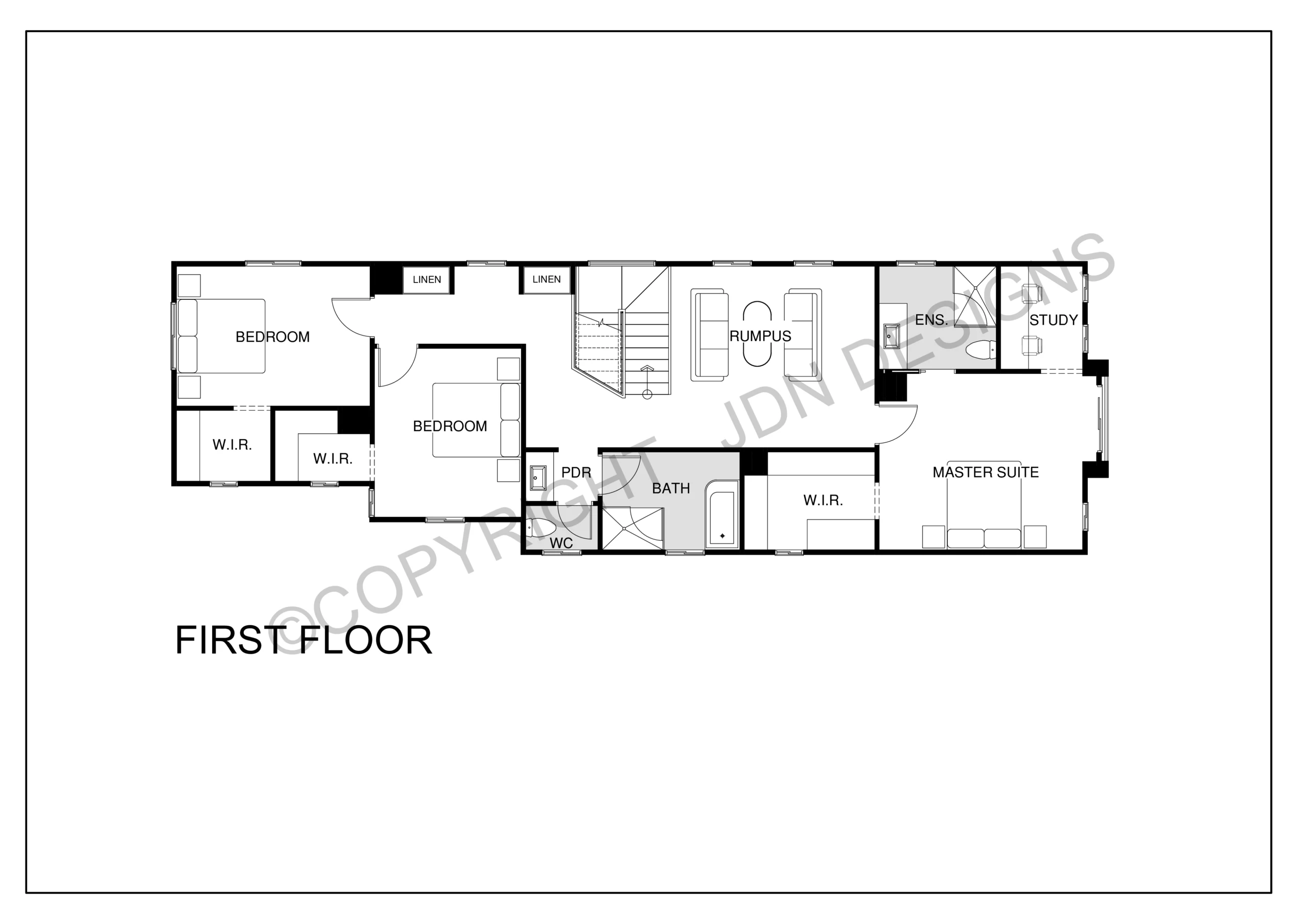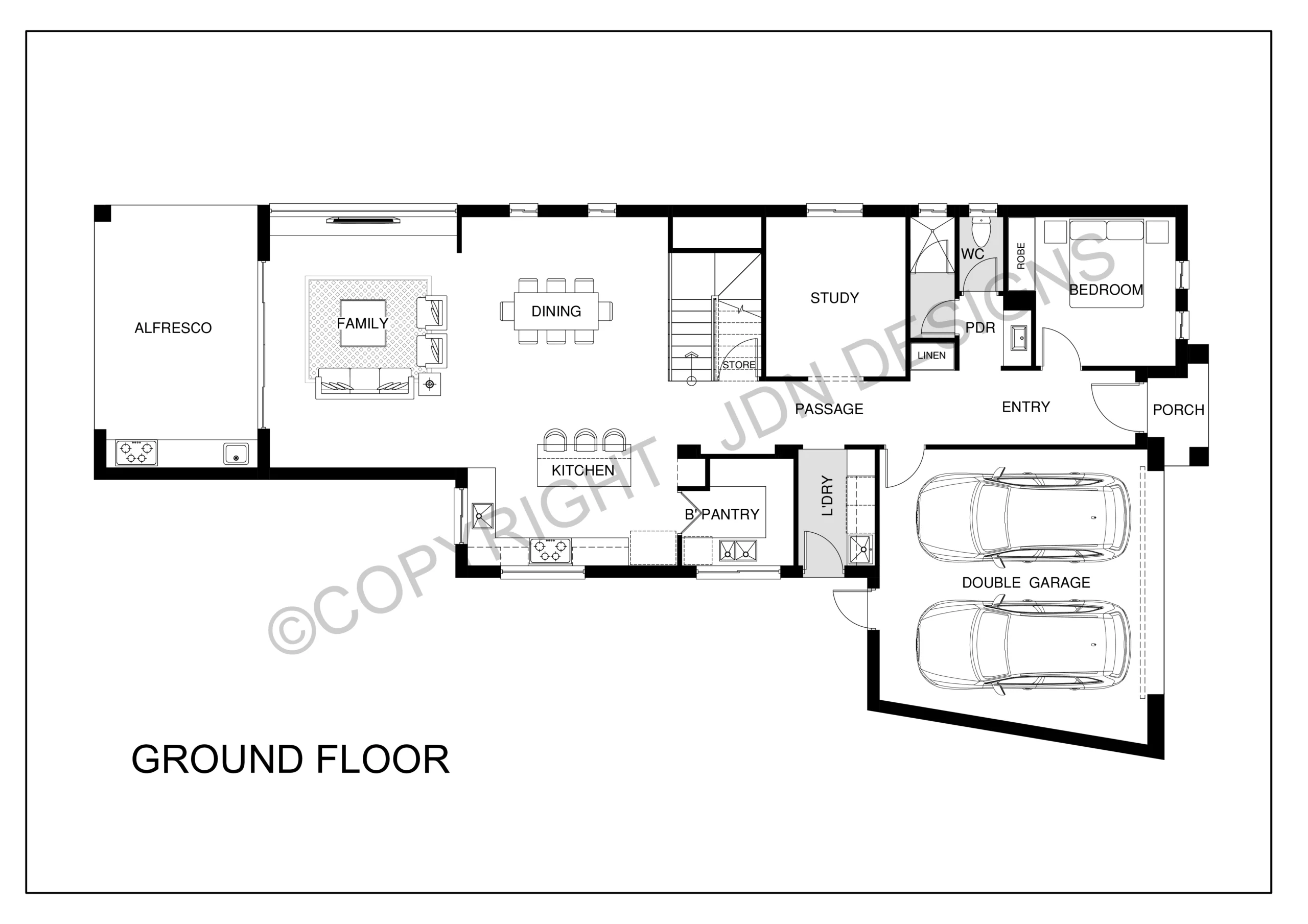On the ground floor, there’s a large open kitchen with a butler pantry, double garage and alresco, while upstairs features three bedrooms with walk-in robes, a main bedroom with ensuite, a study nook, and a children’s activity area – making it an ideal family home design. This special double storey house has two study rooms one on the ground floor and other on first floor for kids who are doing studies.