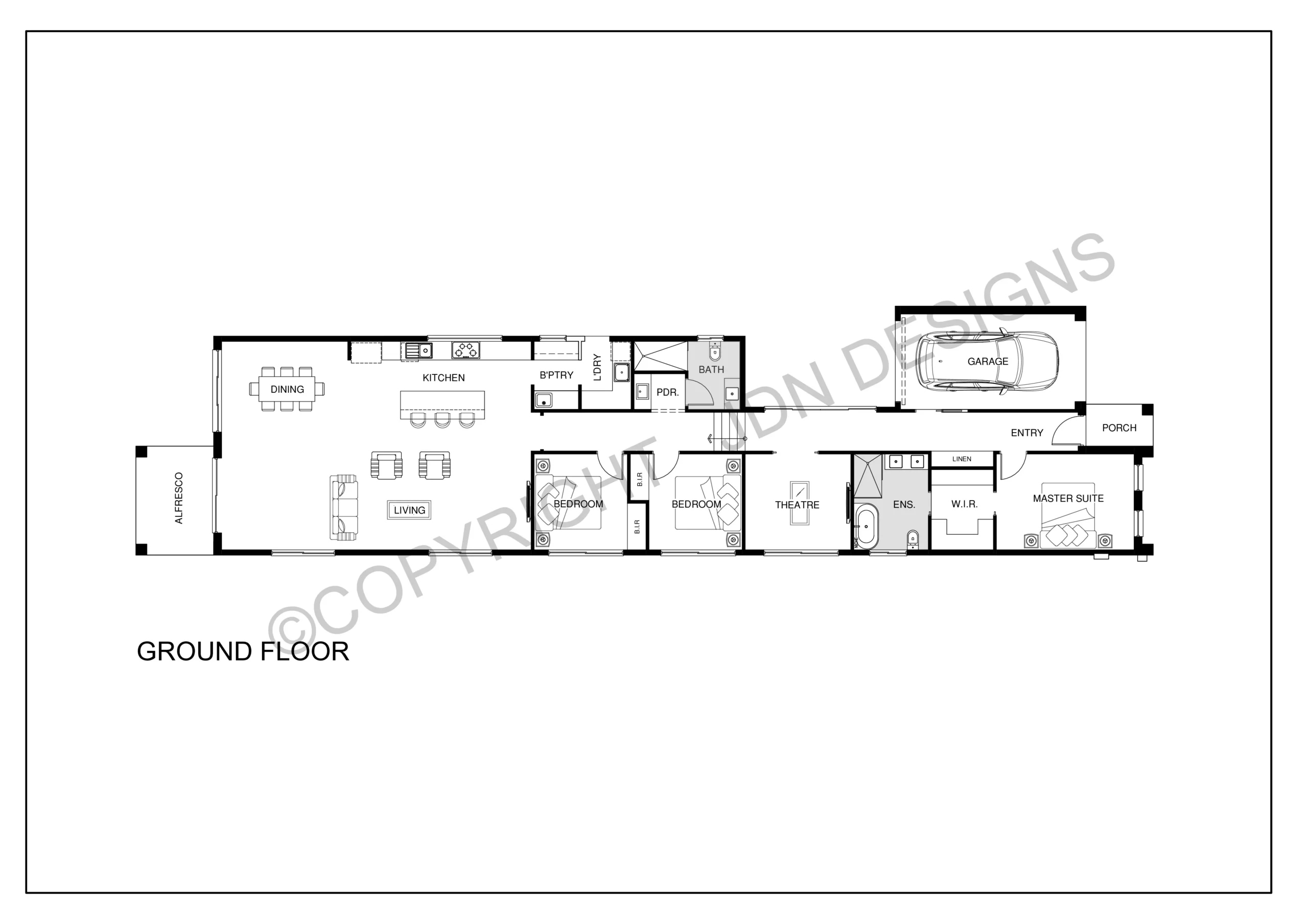 This three Bedroom home design features a spacious main bathroom located just up from bedrooms two and three, both with built in robes. The comfortable main bedroom separated from the front bedrooms offers privacy and convenience. Entertaining friends is simple thanks to the theater area positioned in the heart of the home.